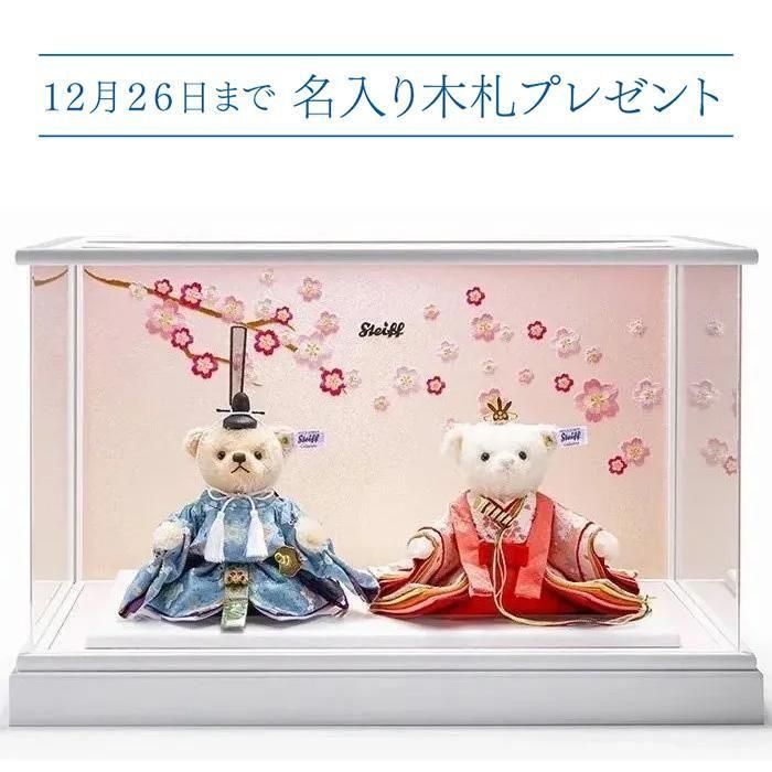 ホーム >テディベア限定品 シュタイフ テディベア ひな人形「桜うさぎ」 【ケースセット】各15cm EAN679230-1 ※2025年12月26日まで木札プレゼント&お値引き中です。ご希望の方は備考欄へ「生年月日」と「お名前」をご記入ください。 毎年大変ご好評をいただいております雛人形「桜うさぎ」のベアちゃんです♪ こちらは雛人形と専用ケースのセットになります。 お殿様はブルー、お姫様にはピンクの明るく爽やかなお着物をあしらった、さわやかな風が吹く春の桃の節句にピッタリのひな人形となっております(^^) 小物やお着物は、ひな人形ブランド「寿慶」によってつくられた日本製。 細部まで丁寧にうつくしくつくられています。 お着物の柄にあしらわれたうさぎは「長い耳が福を集める」「飛び跳ねることから飛躍を意味する」など、かわいらしいだけでなく、縁起物としての意味もあります。 年に1回のお披露目をする毎年の「ひな祭り」の季節がますます楽しくなる。 そんな素敵な「ひな人形」を、ぜひこの機会にお迎えくださいませ♪ ※屏風と台座、ひな人形ケースは付属しております。 ※ご注文後のキャンセルはできかねます。ご容赦くださいませ。 ※玩具としてのお取り扱いは推奨しておりません。観賞用としてお楽しみください。 ※大型商品となりますためラッピングに対応しておりません。 ※ひな人形にはシュタイフの限定箱が付属します。 日本限定 サイズ:テディベア15cm、台座幅45cm・奥26cm、高25cm ケースサイズ:外寸:幅56×奥33×高36cm/内寸:幅51×奥28×高29cm セット内容:ベア(2体、着物の着脱不可)、台座、屏風、小物(烏帽子、太刀、扇、天冠) 海外名:Steiff Hina Teddy bear 商品番号:679230-1 素材:モヘア ※サイズはおおよその大きさとなります。 商品番号 679230-1 小売希望価格 168,300円(税込) 販売価格 159,800円(税込) 購入数 セット 【発送までの日数】 3〜5営業日ほどで発送いたします。※即納商品は翌営業日に発送いたします。商品が欠品していた際は、お届けまでにお時間を頂戴する場合やキャンセルとなる場合がございます。ご予約商品は記載の日程にて発送いたします。お届け日数・在庫を事前に確認をされたい場合は、お手数ですがこちらからお問い合わせください。 【送料について】 ご購入金額が10,000円以上で送料無料。7,000円〜10,000円未満で680円。7,000円未満で880円となります。 【お支払い方法】 PayPay決済・AmazonPay・クレジット決済・代金引換・銀行振込・コンビニ払いよりお選びいただけます。 商品カテゴリー
