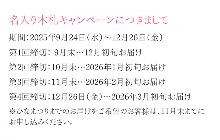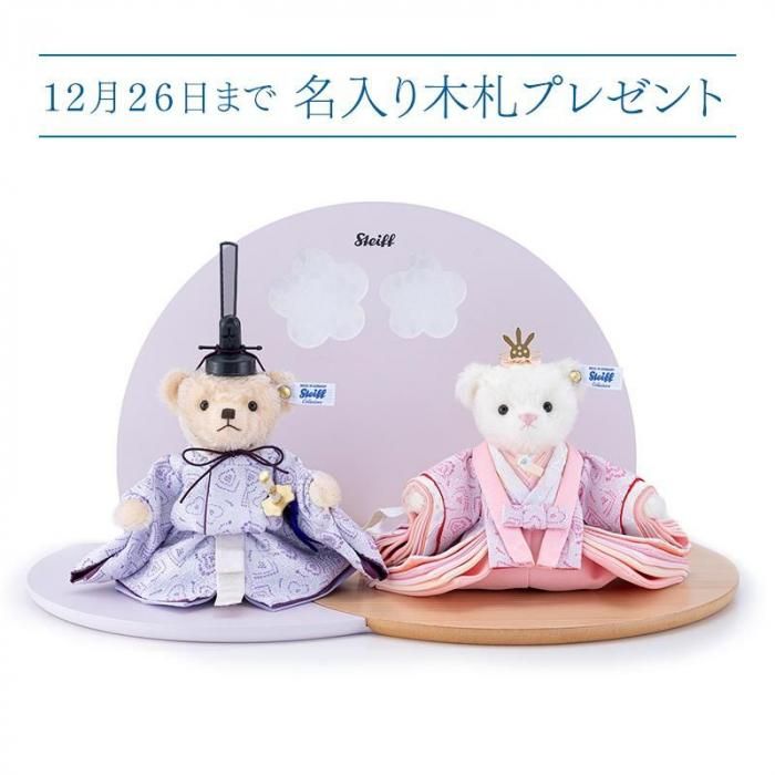 ホーム >テディベア限定品 【ご予約作品】シュタイフ テディベア ひな人形 「ハート」&台屏風 桜透かしセット 15cm EAN679230-7a ★12月26日までお値引き&名入り木札プレゼント中! ★こちらは「ひな人形」と「台屏風 桜透かし」のセットです。 人気のシュタイフ テディベアひな人形の最新作♪ お殿様、お姫様それぞれの衣裳にたくさんのハートをあしらったとてもかわいらしいひな人形テディベアです。 紫とピンクの淡い衣装に包まれたひな人形は、3月3日の桃の節句に彩りとやさしい華やかさを添えてくれます。 お部屋に飾るだけで春の訪れを感じ、女の子の健やかな成長を祈る心をより一層深めてくれます。 インテリアにもなじむ優しい色合いは、贈り物にも記念品にもぴったりの作品です。 ※2025年12月26日まで木札プレゼント中です。ご希望の方は備考欄へ「生年月日」と「お名前」をご記入ください。 ※こちらの作品は2025年12月頃入荷予定の作品です。 ※シュタイフ社の生産状況によりお届け時期が前後する場合がございます。 ーご確認くださいーー 人気商品のためご予約お申し込み後、ご注文確認のご連絡をもってご予約の確定とさせていただきます。 ご連絡につきましては1-2営業日ほどお時間を頂戴いたします。 恐れ入りますがご容赦いただけましたら幸いです。 ーーーーーーーーーー サイズ:高さ15cm(ベアのみ) 台屏風サイズ:幅50cm×奥25cm×高28.2cm 海外名:Steiff Hina Teddy bear Set 商品番号:679230-6a ・セット内容 テディベア殿、付属品(冠、纓、太刀) テディベア姫、付属品(玉串、扇) 台屏風 桜透かし ※テディベアからの衣装の着脱不可となります。 商品番号 679230-7a 小売希望価格 115,500円(税込) 販売価格 109,800円(税込) 購入数 セット 【発送までの日数】 3〜5営業日ほどで発送いたします。※即納商品は翌営業日に発送いたします。商品が欠品していた際は、お届けまでにお時間を頂戴する場合やキャンセルとなる場合がございます。ご予約商品は記載の日程にて発送いたします。お届け日数・在庫を事前に確認をされたい場合は、お手数ですがこちらからお問い合わせください。 【送料について】 ご購入金額が10,000円以上で送料無料。7,000円〜10,000円未満で680円。7,000円未満で880円となります。 【お支払い方法】 PayPay決済・AmazonPay・クレジット決済・代金引換・銀行振込・コンビニ払いよりお選びいただけます。 商品カテゴリー